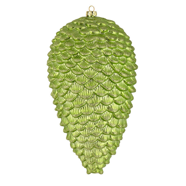 Add some sparkle to your holiday decorating projects with these 10″ Celadon Matte Glitter Pine Cones, featuring a matte finish with glitter accents. Made with shatterproof plastic. The ornament has a drilled cap secured with green floral wire. Includes 2 pieces per box.