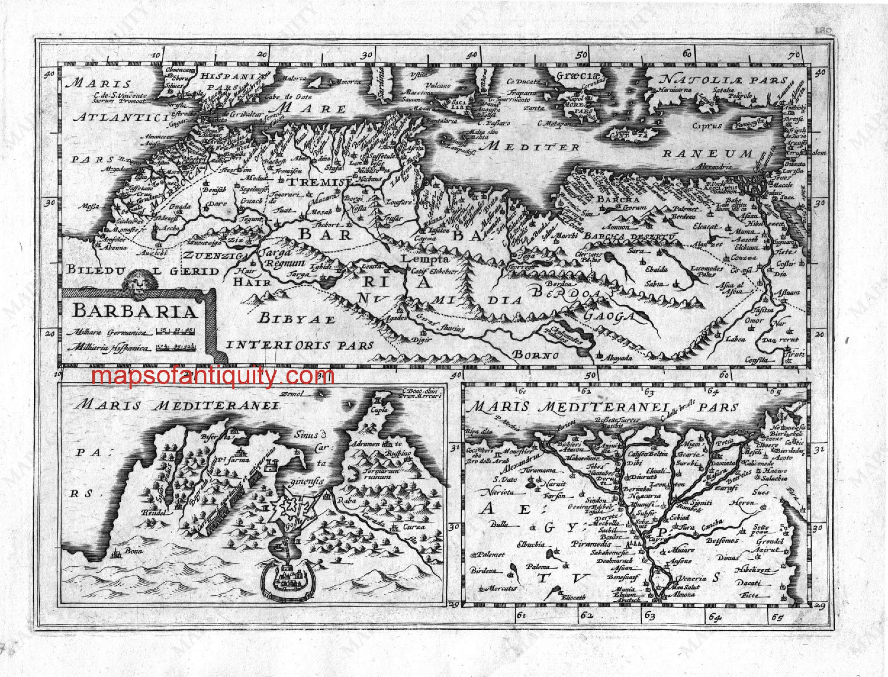 Mercator’s antique black and white engraved map of the north coast of Africa, “Barbaria” in Latin, and including Gibraltar, the Mediterranean and the continental tips and islands of western Europe, with insets of Tunis and the Gulf of Tunis, and of Alexandria as they appeared in the early 17th century. Very good overall antique condition, measures approximately 12.5 x 21.5 inches.