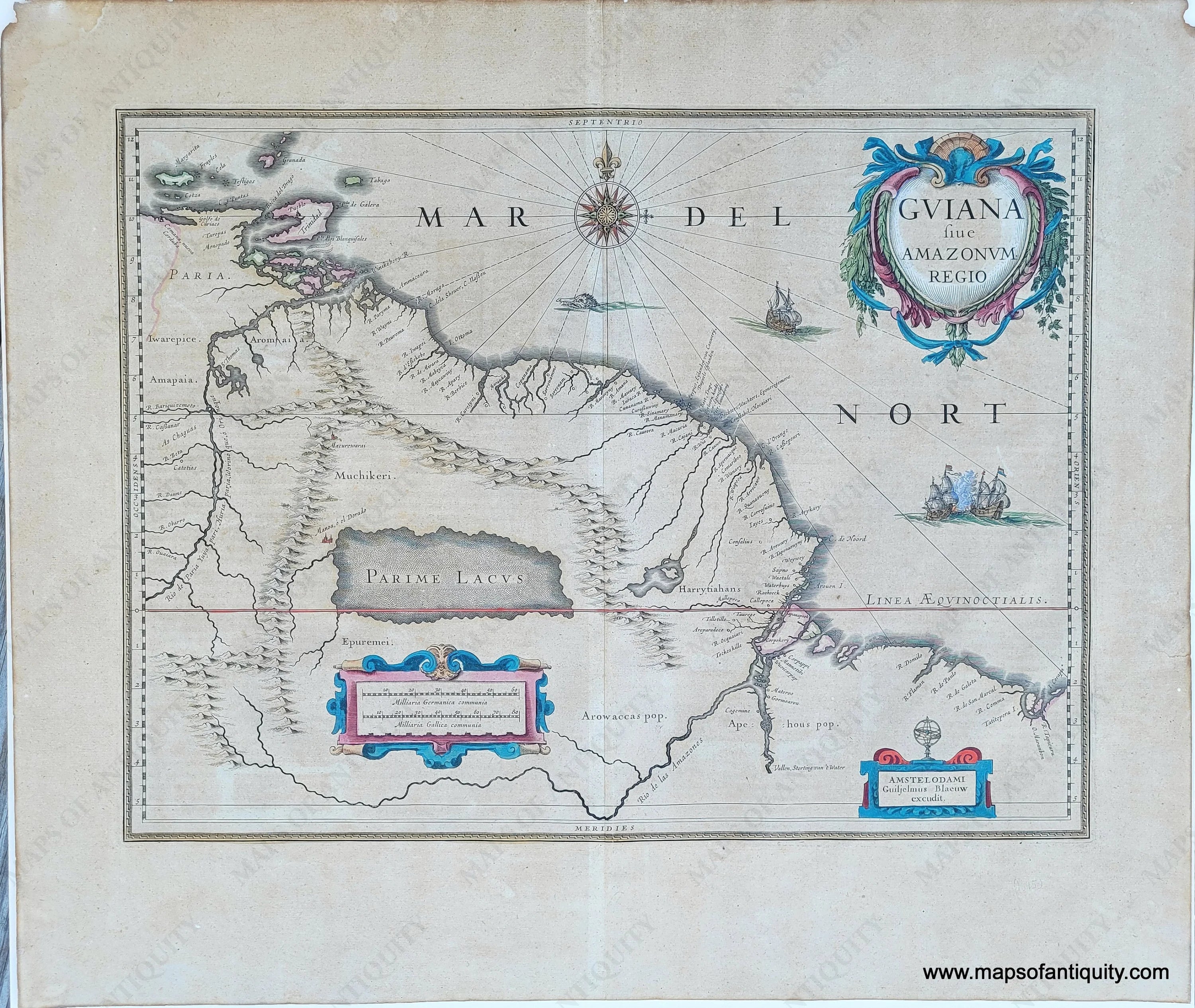 Antique map of part of South America by Blaeu, c. 1640. This map covers the north-eastern coast including modern day Trinidad and Tobago, Guyana, Suriname, and French Guiana as well as part of Venezuela and part of Brazil with the Amazon River and the Orinoco River. Most notably, this map includes Parime Lacus or Lake Parime. Lake Parime or Lake Parima is a legendary lake located in South America. It was reputedly the location of the fabled city of El Dorado, also known as Manoa, much sought-after by European explorers. Repeated attempts to find the lake failed to confirm its existence, and it was dismissed as a myth along with the city. With decorative cartouche, compass, ships, and a sea monster. An exciting map for a collector who enjoys the apocryphal. Good to very good condition with toning and some minor wear at the paper edges and very slight wear on the paper surface near the center. Measures approx. 14.5 x 19.5 inches to the neatline.