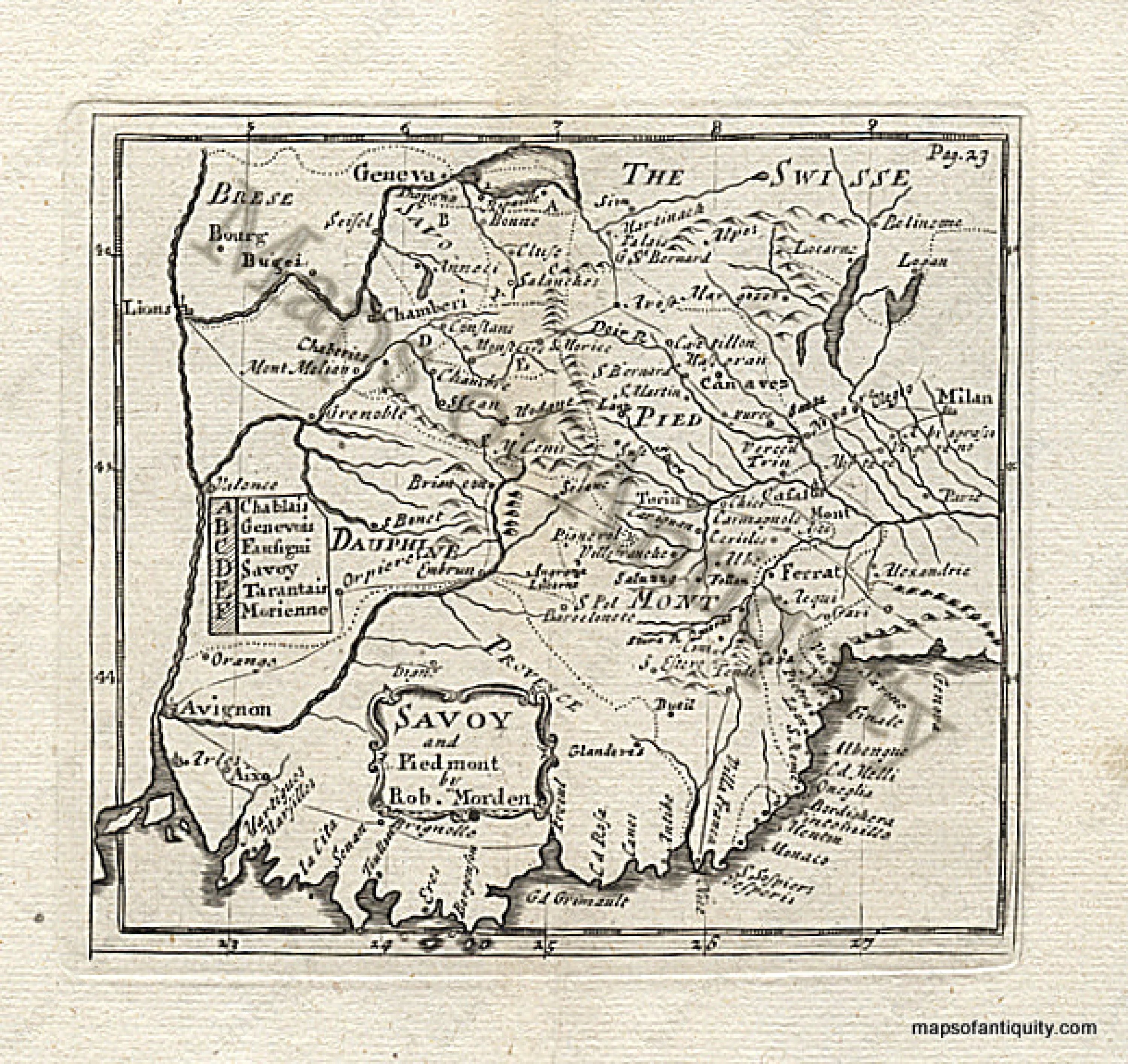 Black and white engraved antique map of Savoy and Piedmont, part of France and Italy. Very good condition, approx. 4.5 x 5.25 inches.