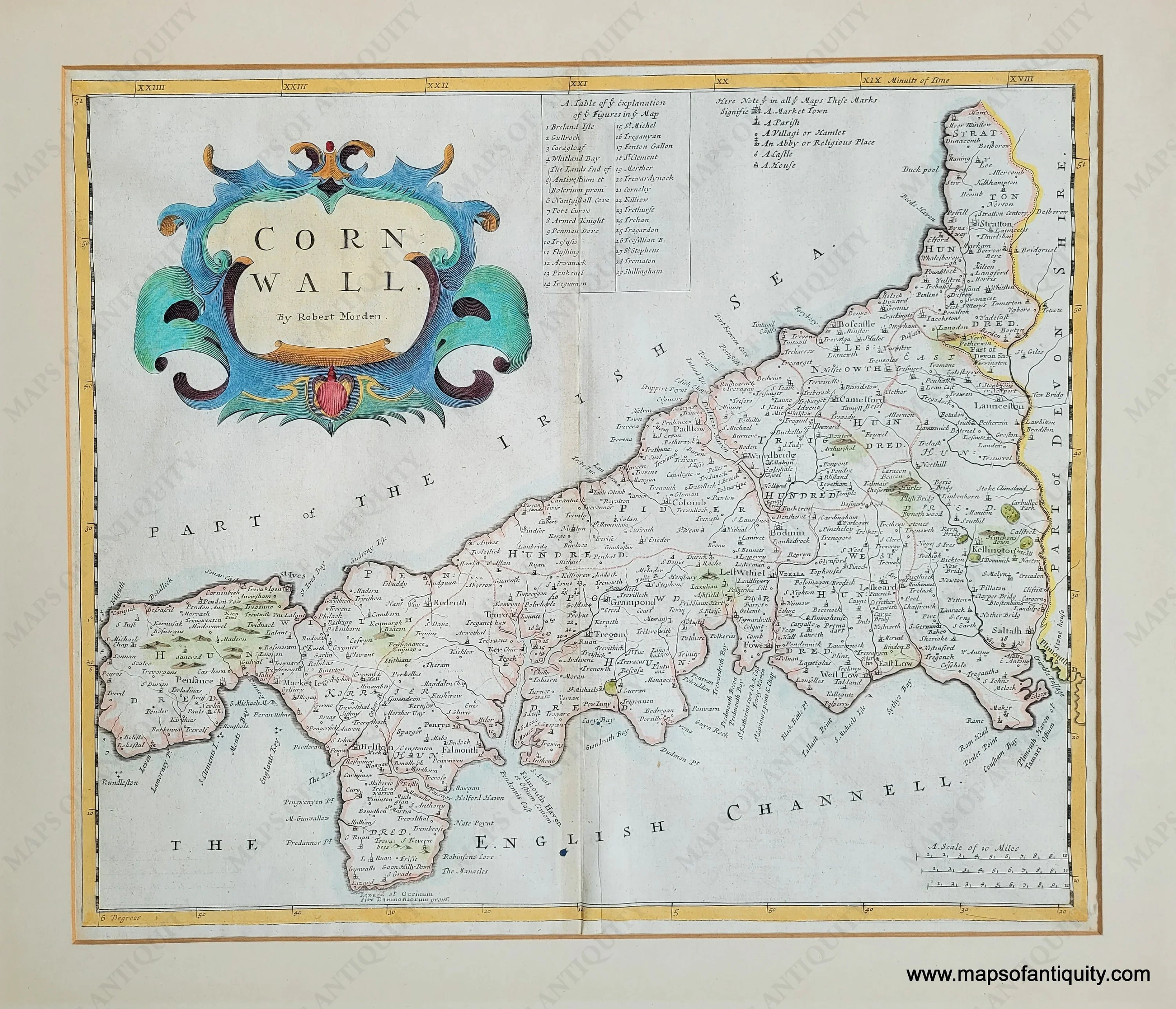 Antique hand-colored map of Cornwall, a historic county and ceremonial county in South West England, by Robert Morden, first published in 1695 and again in 1722. This map is undated and it is unclear in which edition of Camden’s “Britannia: Or a Chorographical Description of Great Britain and Ireland Together with the Adjacent Islands…” this map was published. It shows towns, villages, country estates, roads, and more. Topographic information is depicted pictorially. Elegant hand coloring and a handsome cartouche. Very good antique condition with minor signs of age, such as toning. Center fold as issued. Measures approx. 14.25 x 16.75 inches to the neatline. Map is matted but the mat is not archival and should be changed when framing.
