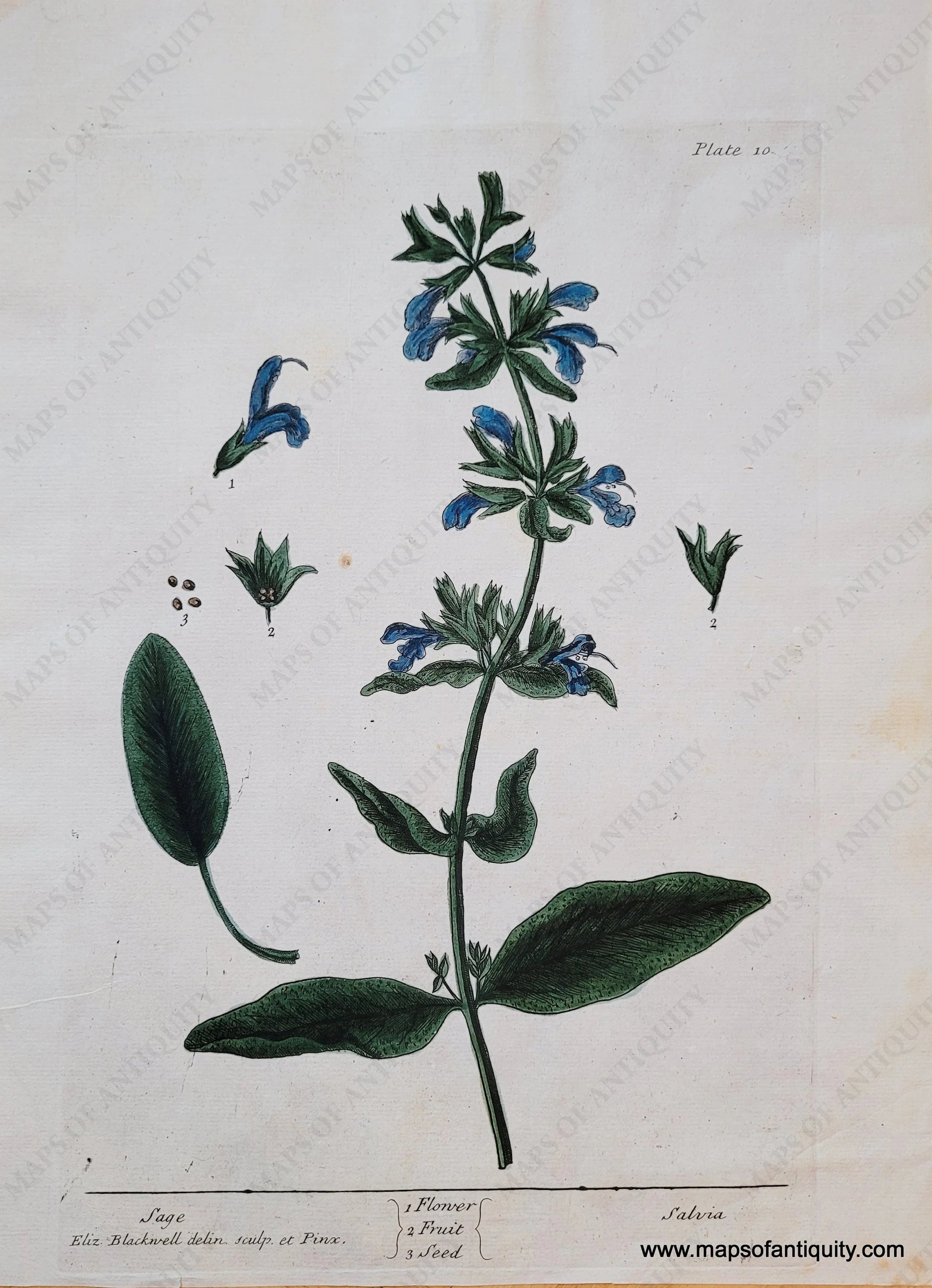 Antique hand-colored copper plate engraving botanical print of Salvia. Published in A Curious Herbal, 1737-1739 by Elizabeth Blackwell. Her work is particularly notable because she produced it entirely herself- from the initial drawing to engraving the printing plate to printing to hand-coloring. Very good antique condition with mild toning of the paper and some tiny spots. Slight stain on right side. Image measures approximately 12″ x 8″ overall. Paper was trimmed by a previous owner- paper size is approx. 13.5 x 10 inches.