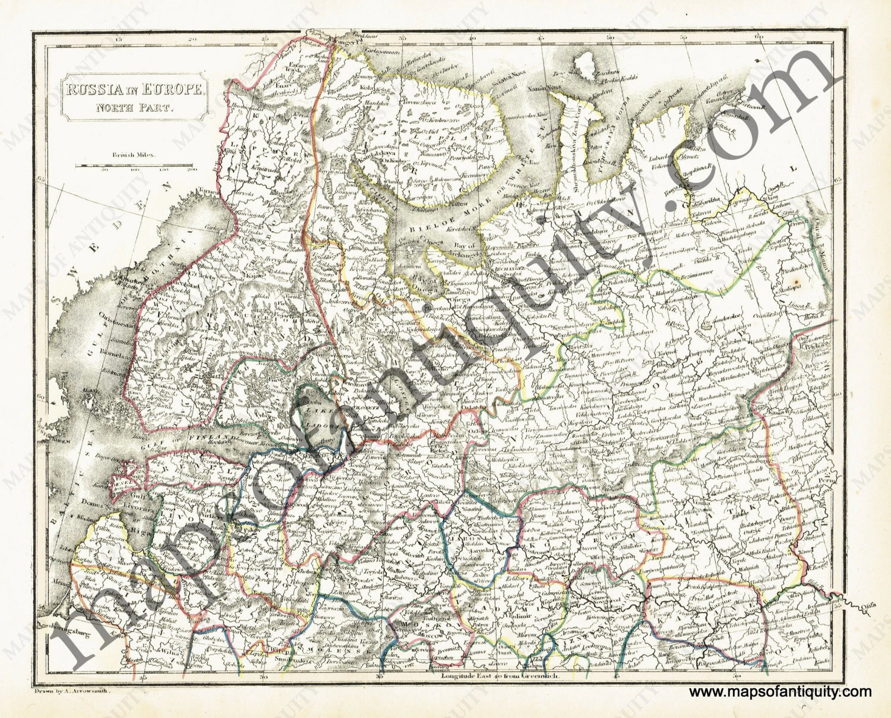 Antique hand colored map of a northern portion of Russia in Europe. Shows topographical detail. Good condition with some mild toning/foxing of the antique paper. By A. Arrowsmith, in A New General Atlas, 1817. Measures approximately 8″ x 10″ to the neatline. (Note: Map extends slightly past the neatline at the bottom right- See picture.)