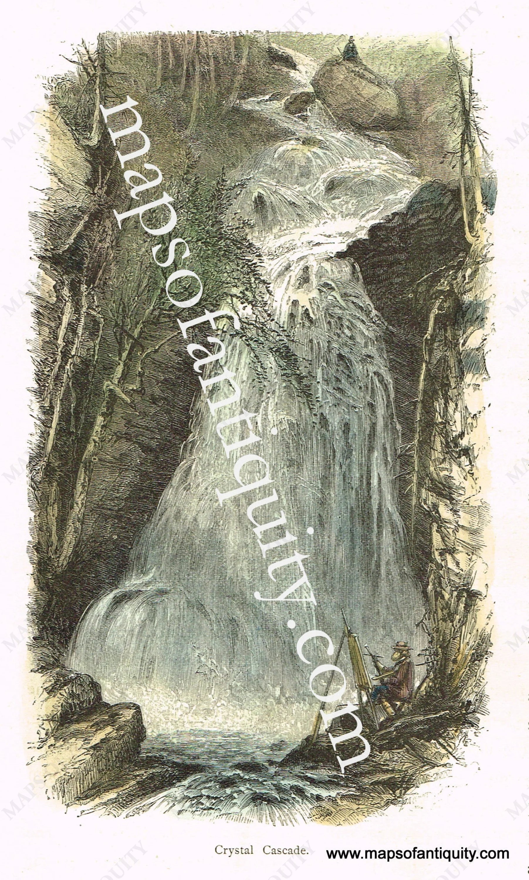 Hand colored antique print showing Crystal Cascade, a waterfall on Mount Washington (of the White Mountains in New Hampshire). Recent hand coloring. Image is in very good condition. From William Cullen Bryant’s classic 1872 work, “Picturesque America.” Image measures approximately 7″ x 4″.