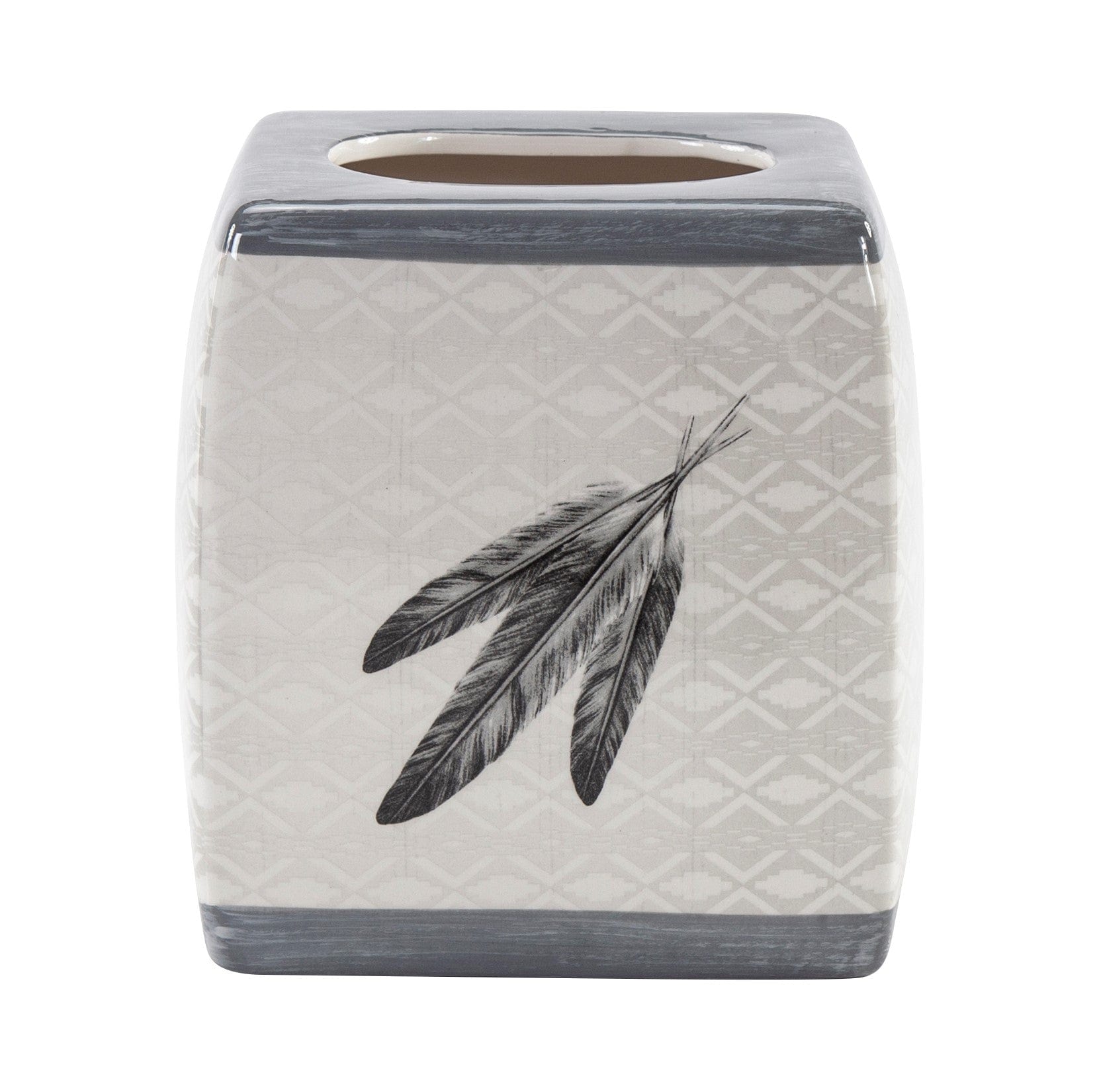 With motifs reminiscent of the Southwestern landscapes and a harmonious blend of taupe and gray, our Feather Design Ceramic Tissue Box offers a soothing touch to your bathroom. A trio of gray feathers rest on a cream background, highlighted by brush-stroke gray borders that lend a handcrafted appearance. A glaze adds a glossy finish, enhancing its elegance. Complement a Southwestern or Western-inspired bathroom with other accessories from our Feather Design Collection.