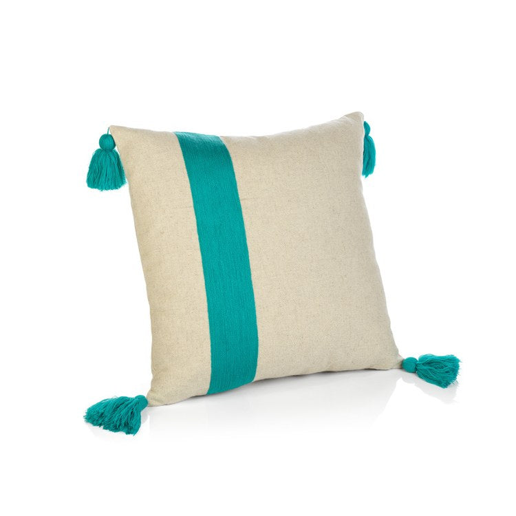 This chic cotton decorative pillow brings a finishing touch to any sofa or armchair. Either on its own or paired with solid color pillows and throws, this beautiful accent will dress up your living room. Featuring a vertical colored band design on a plain beige background with each corner is finished with complementing tassels for added embellishment. For a wow effect, throw it on your porch or patio swing with a warm blanket.