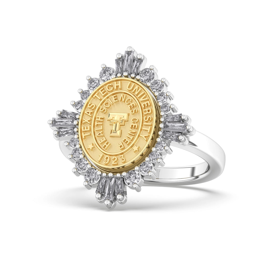 The 310 Glory is one of the most unique styles San Jose Jewelers has to offer. This TTUHSC ring features brilliant-cut stones and 12 tapered baguettes surrounding the Texas Tech Health Sciences Center seal. This TTUHSC ring challenges tradition with a white and yellow gold color combination and a stunning single shank band. If you’re looking for a statement piece, the 310 Glory is it!